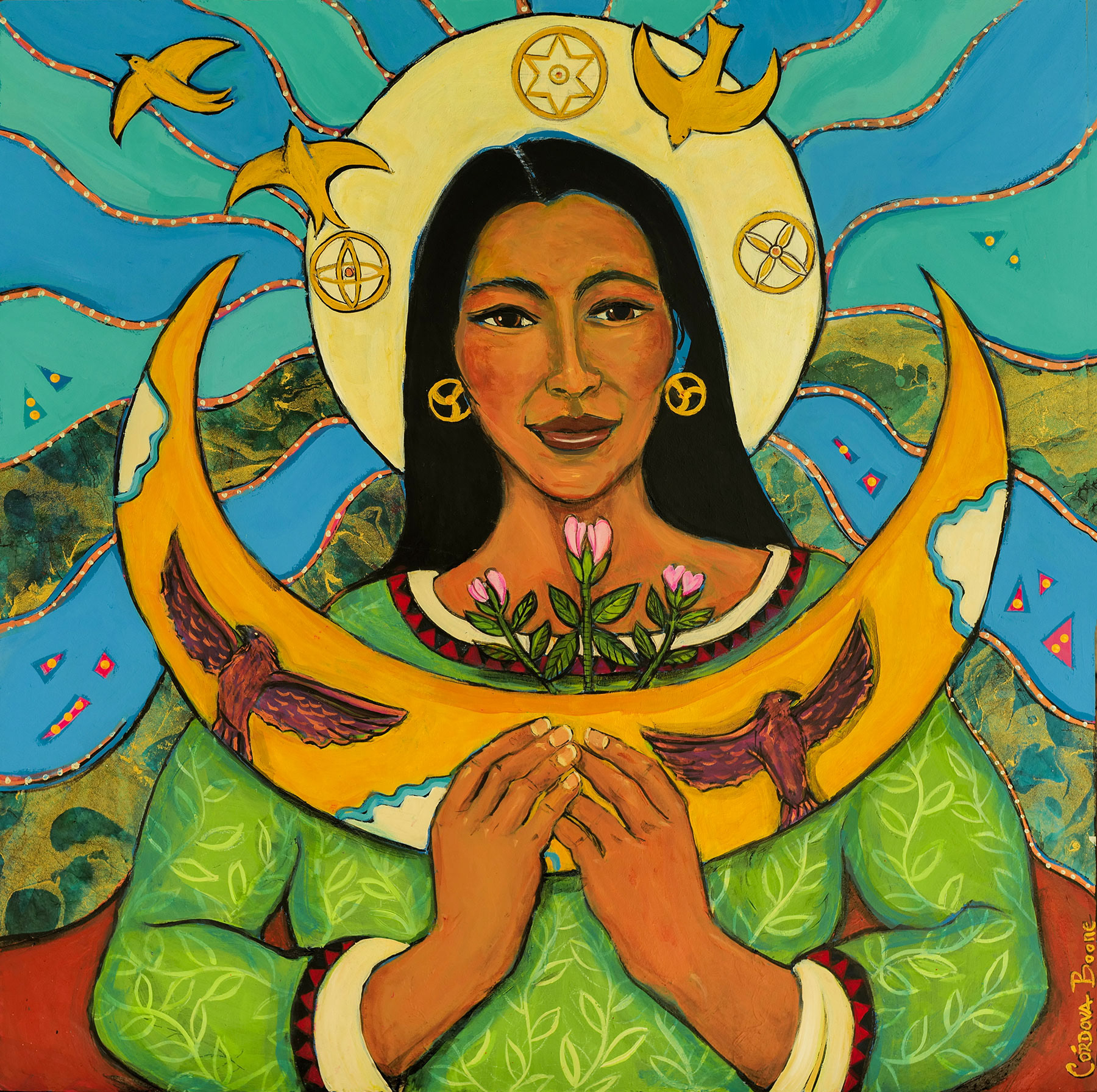 Blossom Dream of Tonantzin, Acrylic on canvas with gold metal leaf, 70 x 70 cm
